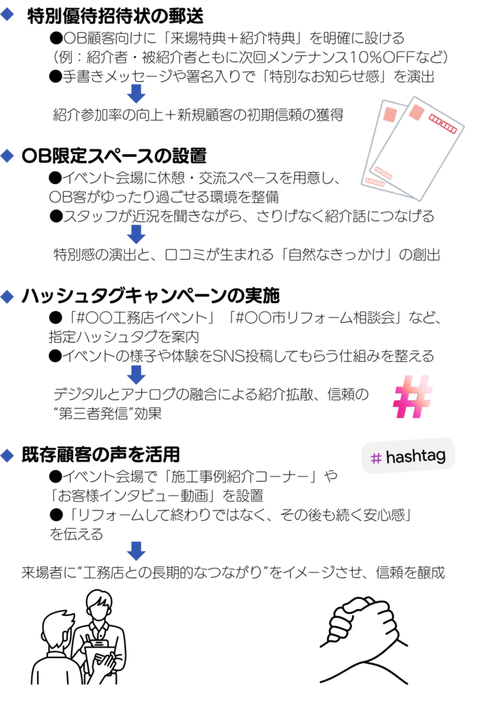 また、OB層向けのイベントでは、「感謝祭」「施工事例発表」などを通して信頼関係を強化すれば、リピートや紹介という“二次的な反響”にもつながります。