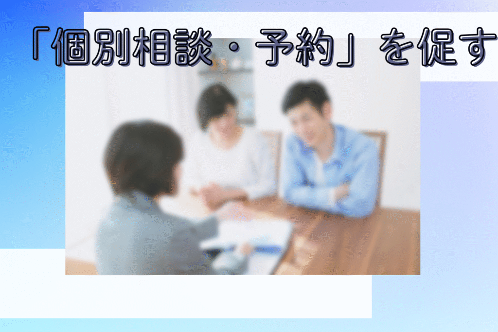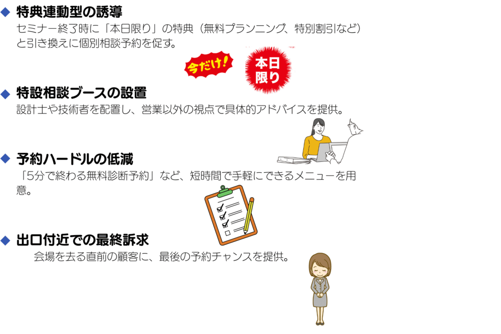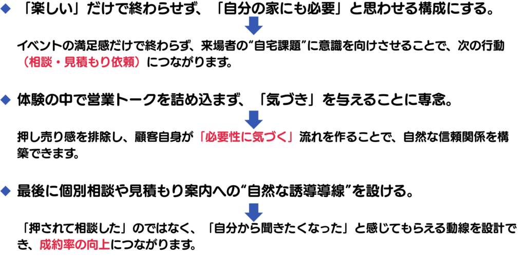 例えば、顕在層向けの相談会であれば、「今すぐ相談できる環境」や「見積もりの比較体験」を設けることで、来場者の意思決定を一気に後押しできます。