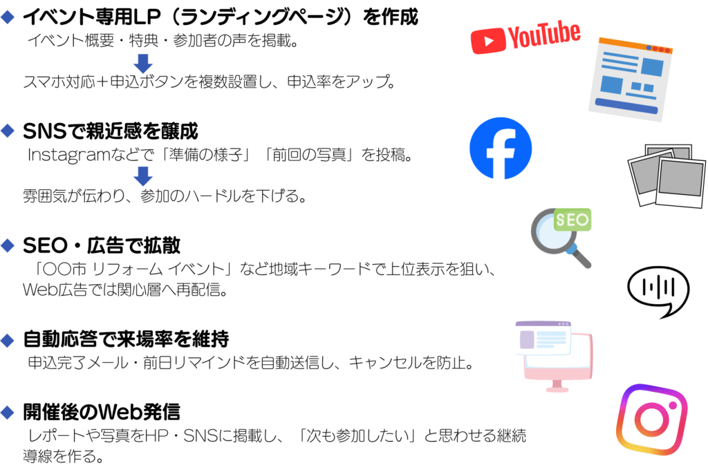 これらの戦略を実践することで、イベントは単なる「お祭り」ではなく、貴社リフォーム事業の成長を加速させる確かな収益源となるでしょう。