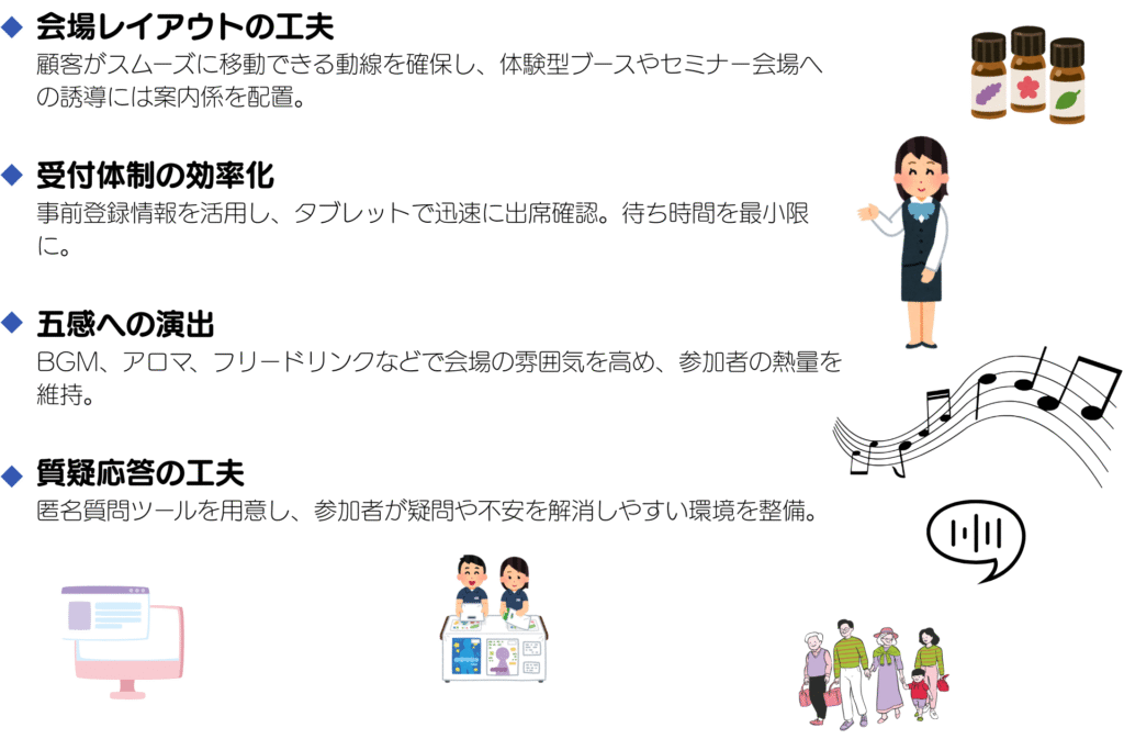 スムーズな動線や快適な空間、五感に訴える演出を整えることで、参加者の熱量を維持し、個別相談や成約につなげやすくなります。