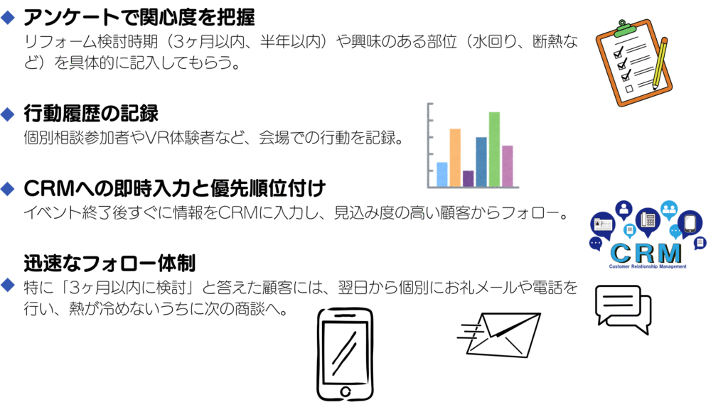 - 迅速なフォロー: イベント中の個別相談への導線を強化し、終了後すぐに関心度に応じた個別アプローチを行うこと。