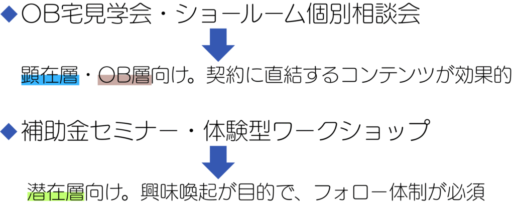 また、OB層向けのイベントでは、「感謝祭」「施工事例発表」などを通して信頼関係を強化すれば、リピートや紹介という“二次的な反響”にもつながります。