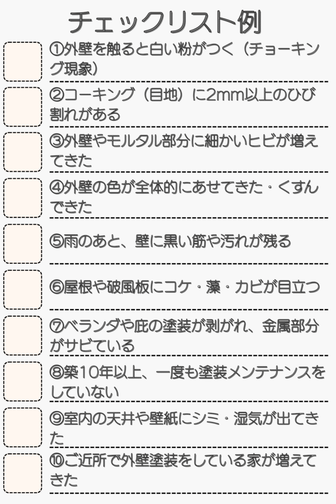 顧客が自分で家の状態を把握できるように、具体的な劣化サインのチェックリストを設けましょう。