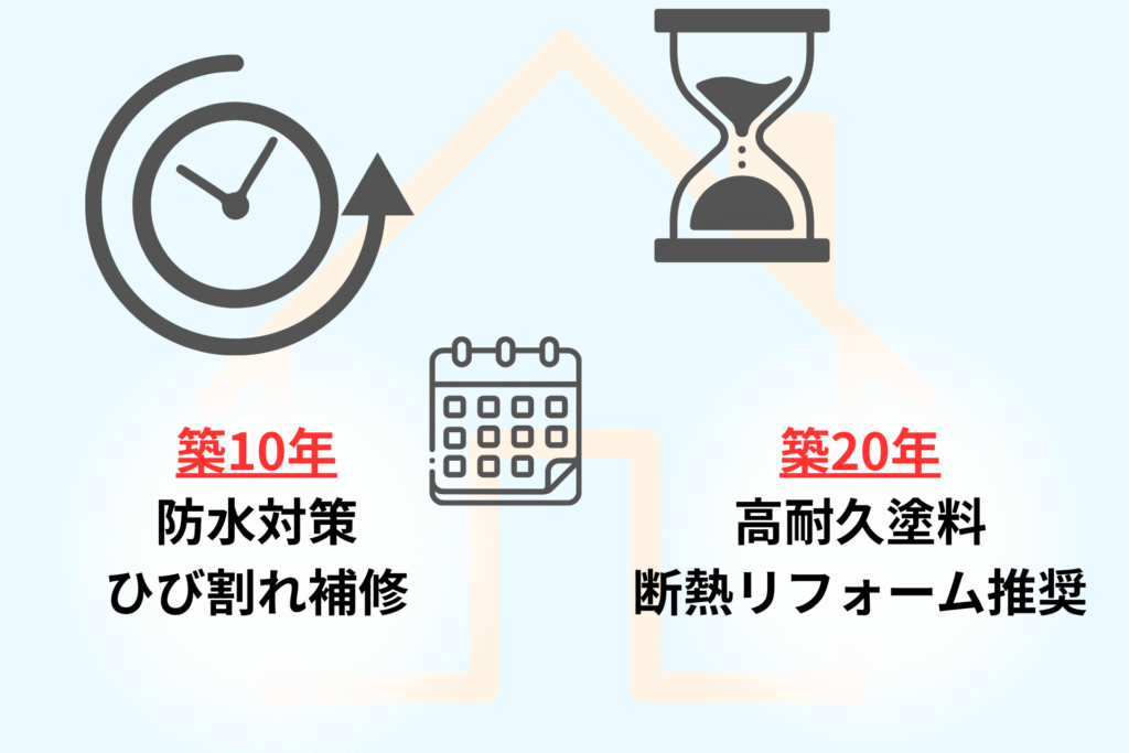 チェックリストで雨漏りの兆候を把握したら、次は住まいの「寿命の目安」を知り、計画的なメンテナンスを考えることが大切です。