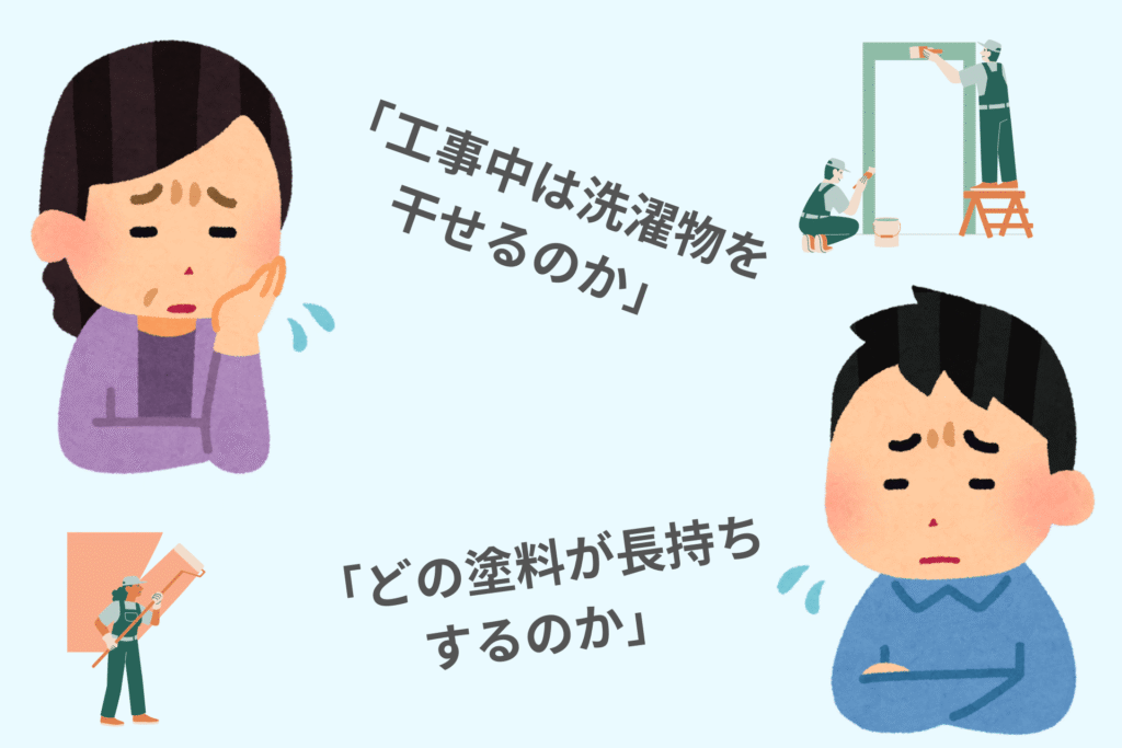 リフォームを検討し始めたお客様の多くは、初めての工事に対して不安を抱きます。例えば、塗装工事においては「生活への影響」や「塗料選び」といった点です。