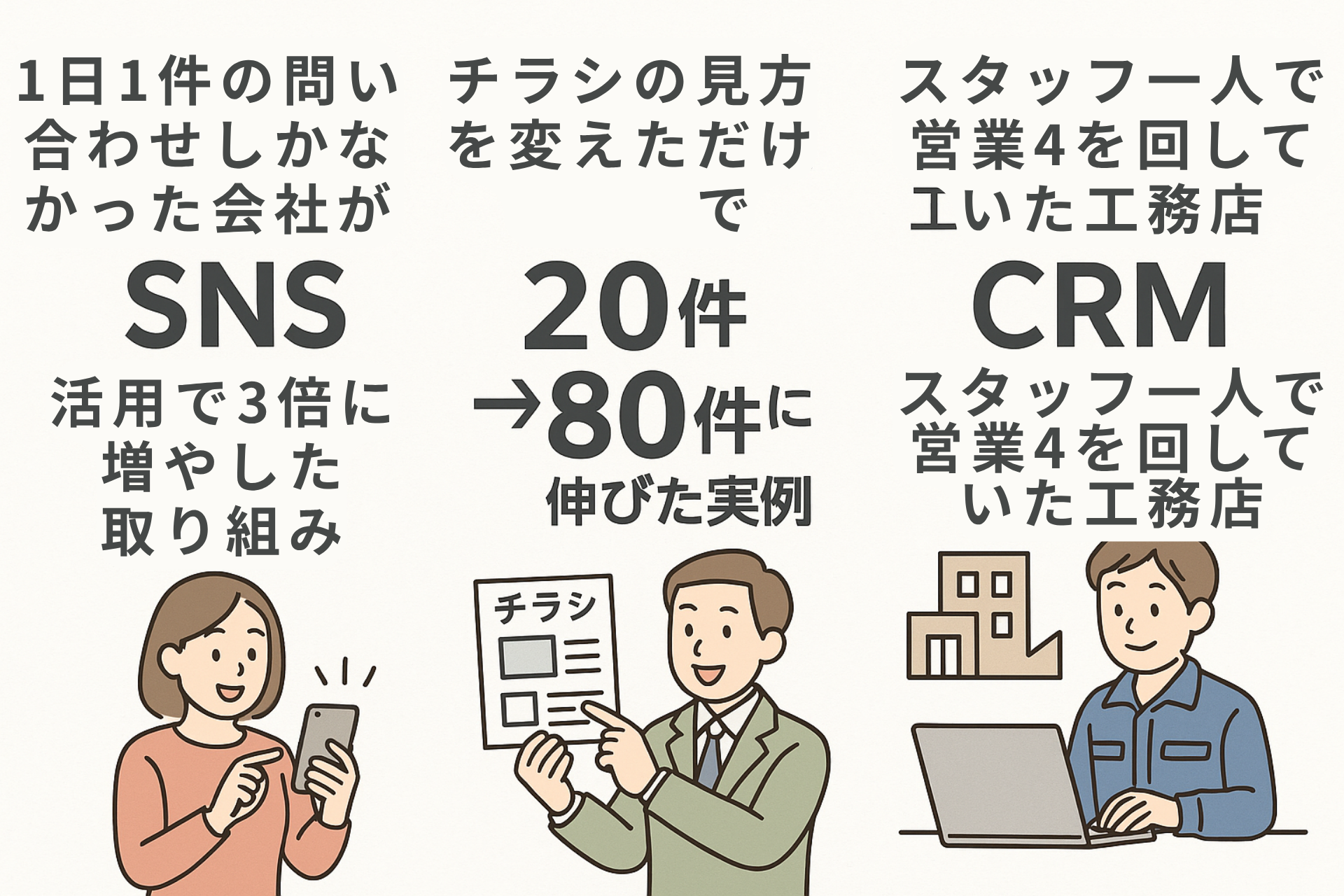新しいチラシづくり、SNSの活用、商談の見せ方、外部パートナーとの連携など、どれも明日から動けるヒントばかりです。