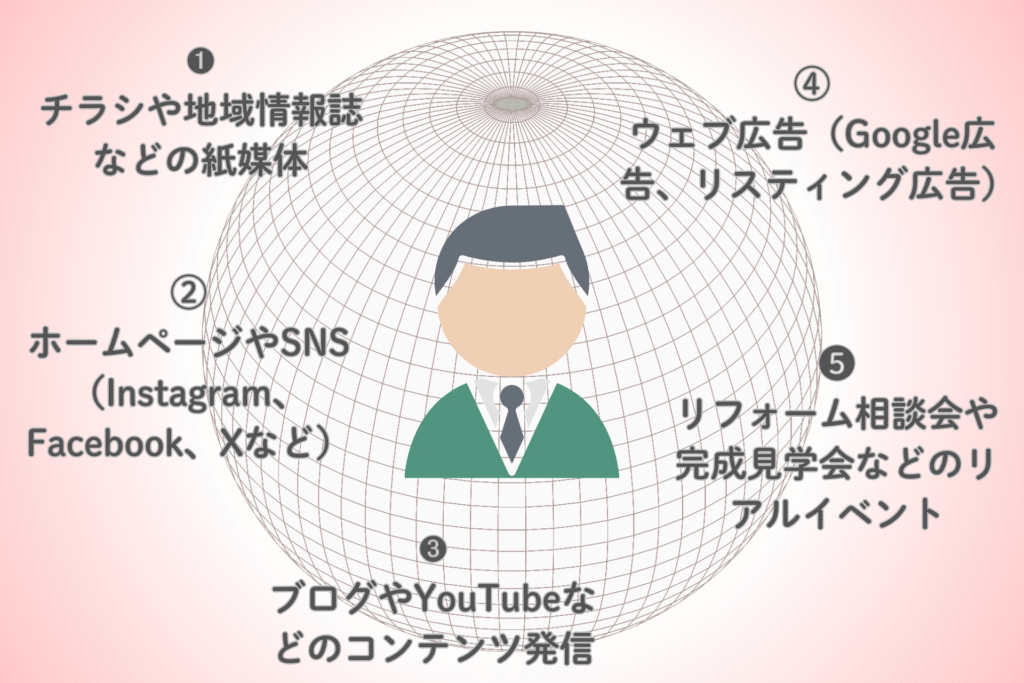 リフォーム営業で反響を増やすためには、「顧客との接点をどれだけ広げられるか」が重要です。